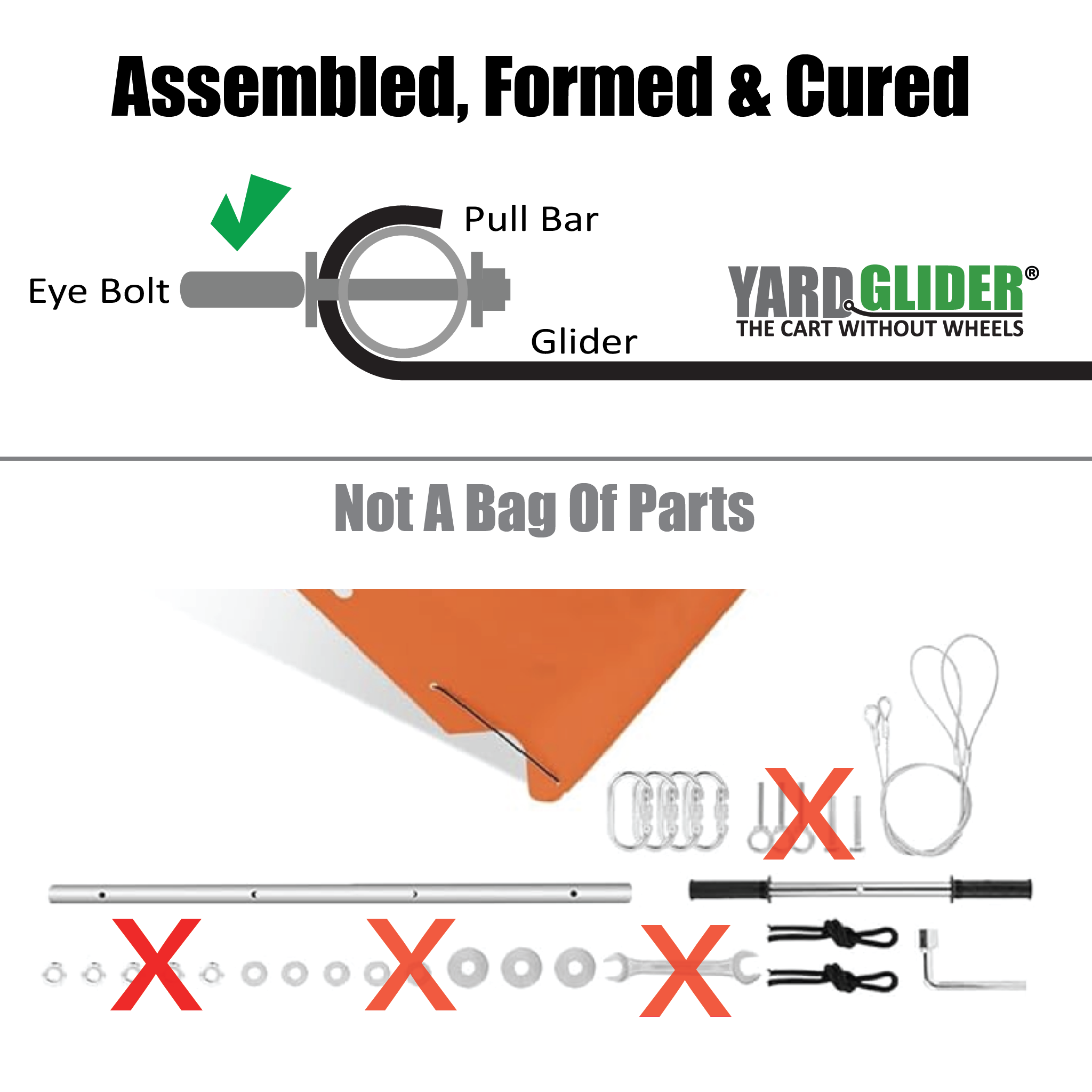 Arrives Ready-to-Work. Skip the frustrating instructions and bag of parts common with weaker, bolt-together imitations. Your Yard Glider arrives fully assembled by our team in Florida, featuring our patented, factory-integrated pull bar. Simply unroll the heavy-duty material, and haul with confidence.